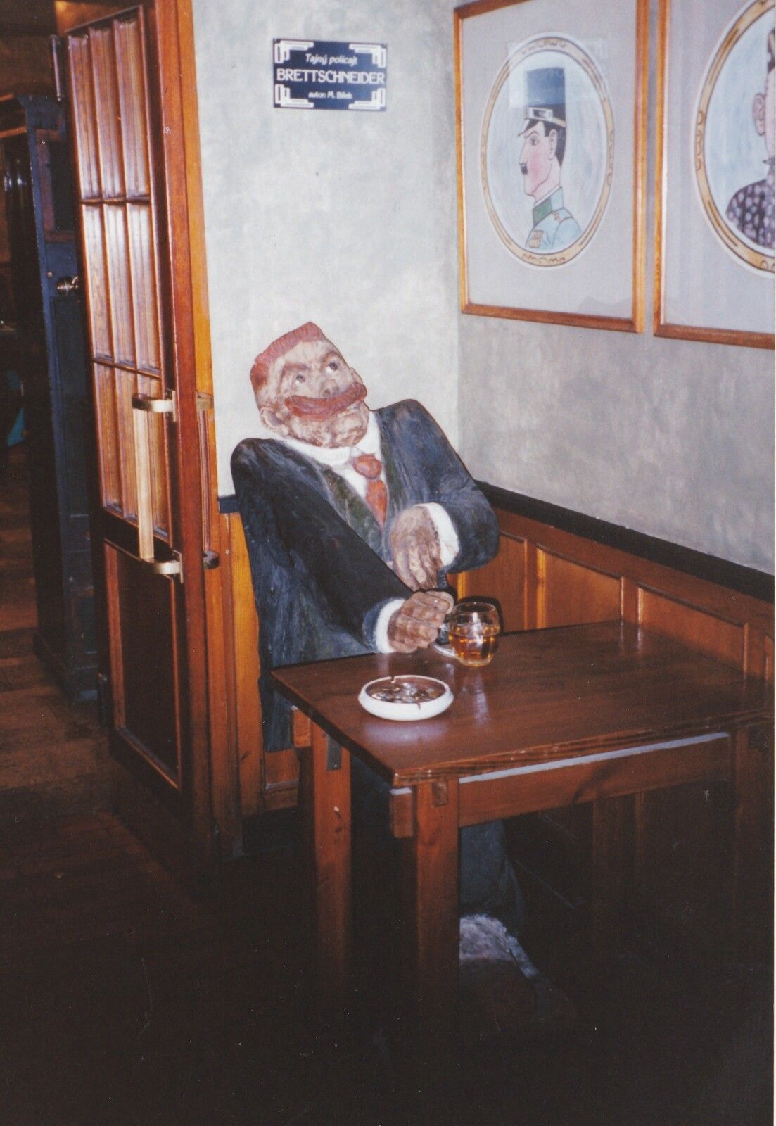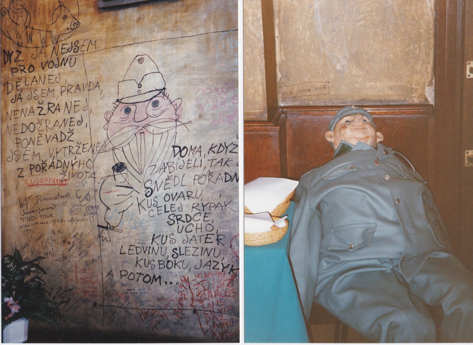 Les aventures du brave soldat Svejk (Jaroslav Hasek). Roman satirique qui montre l’absurdité de la guerre, écrit en 1921/23 qui se passe au lendemain de l'attentat de Sarajevo. Le roman commence dans le restaurant Au calice. Ce restaurant est très fréquenté, les murs sont recouverts de dessins évoquant ce brave soldat, vrai idiot ou faisant semblant de l’être (?). En 1994, nous y avions bu de la bière en chopes de 1 litre et mangé des plats rustiques à base de choux. Brecht a repris le thème pour sa pièce de théâtre qu'il transpose pendant la seconde guerre mondiale.