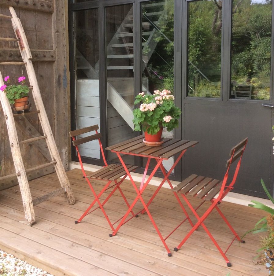 pas de table d'hôtes mais nous avons dîné frugalement (il y a un frigo, une plaque électrique, une cafetière) et nous pouvons utiliser soit la table dans la grande salle soit la petite table dehors.