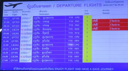 Samedi 28 janvier 6 h 45, notre chauffeur Laï nous conduit à l’aéroport. De là, nous prendrons un ATR 72-500 (72 places) pour Paksé. Les formalités sont vite expédiées et nous avons le temps de prendre un petit déjeuner frugal en salle d’embarquement, et faire quelques emplettes rudimentaires car l’unique boutique est minuscule. Nous décollons à l’heure à 8 h 10.