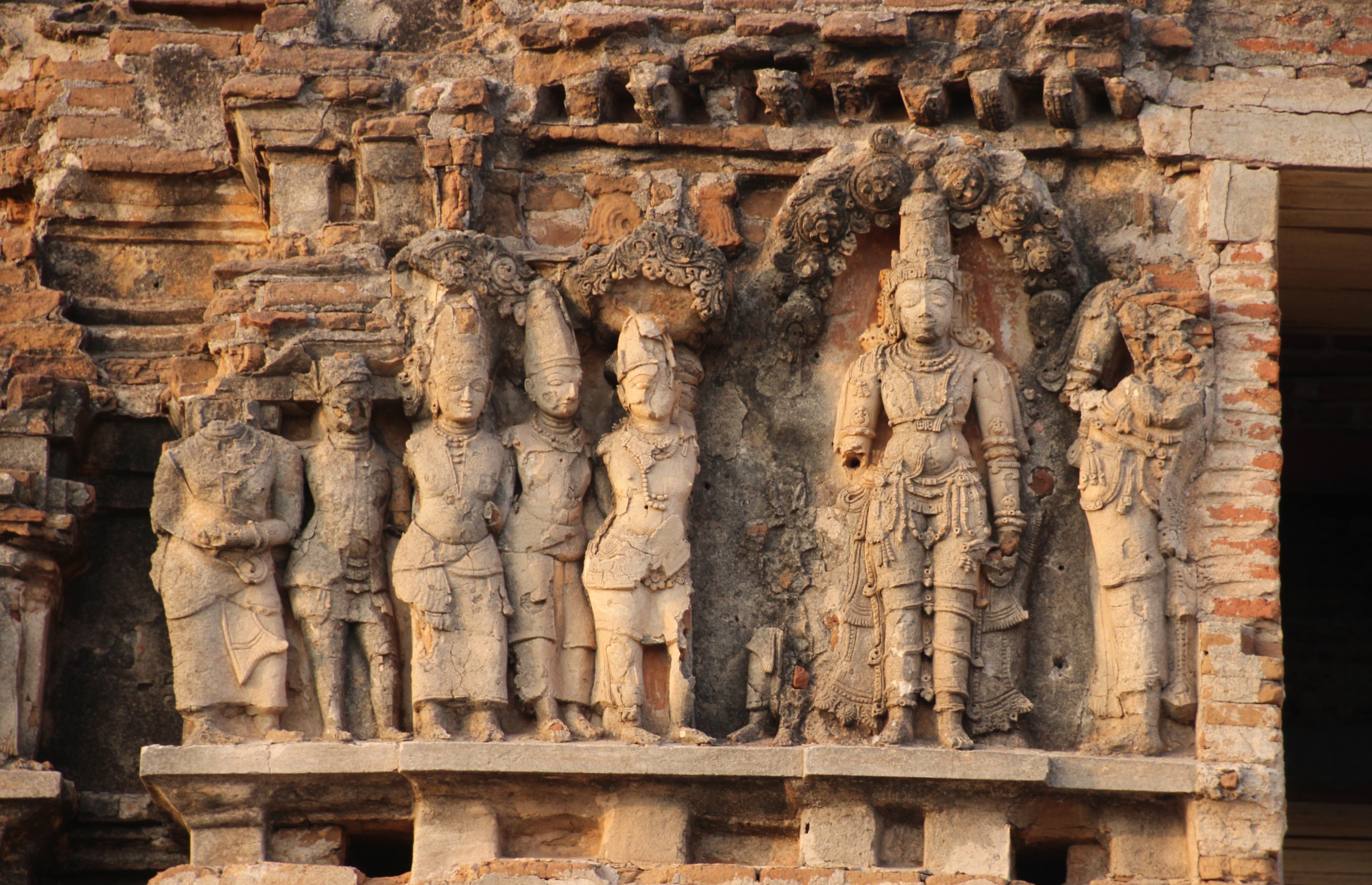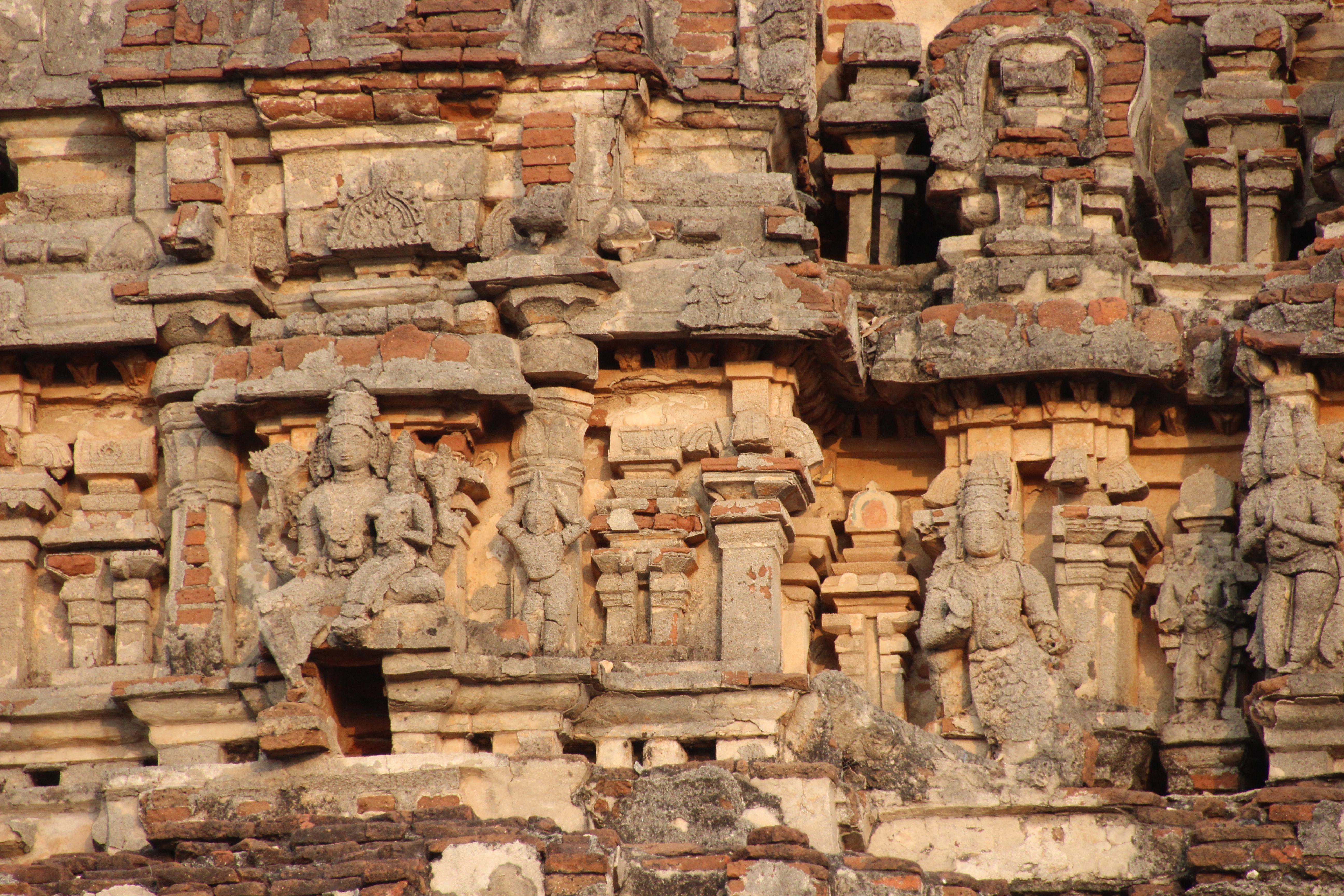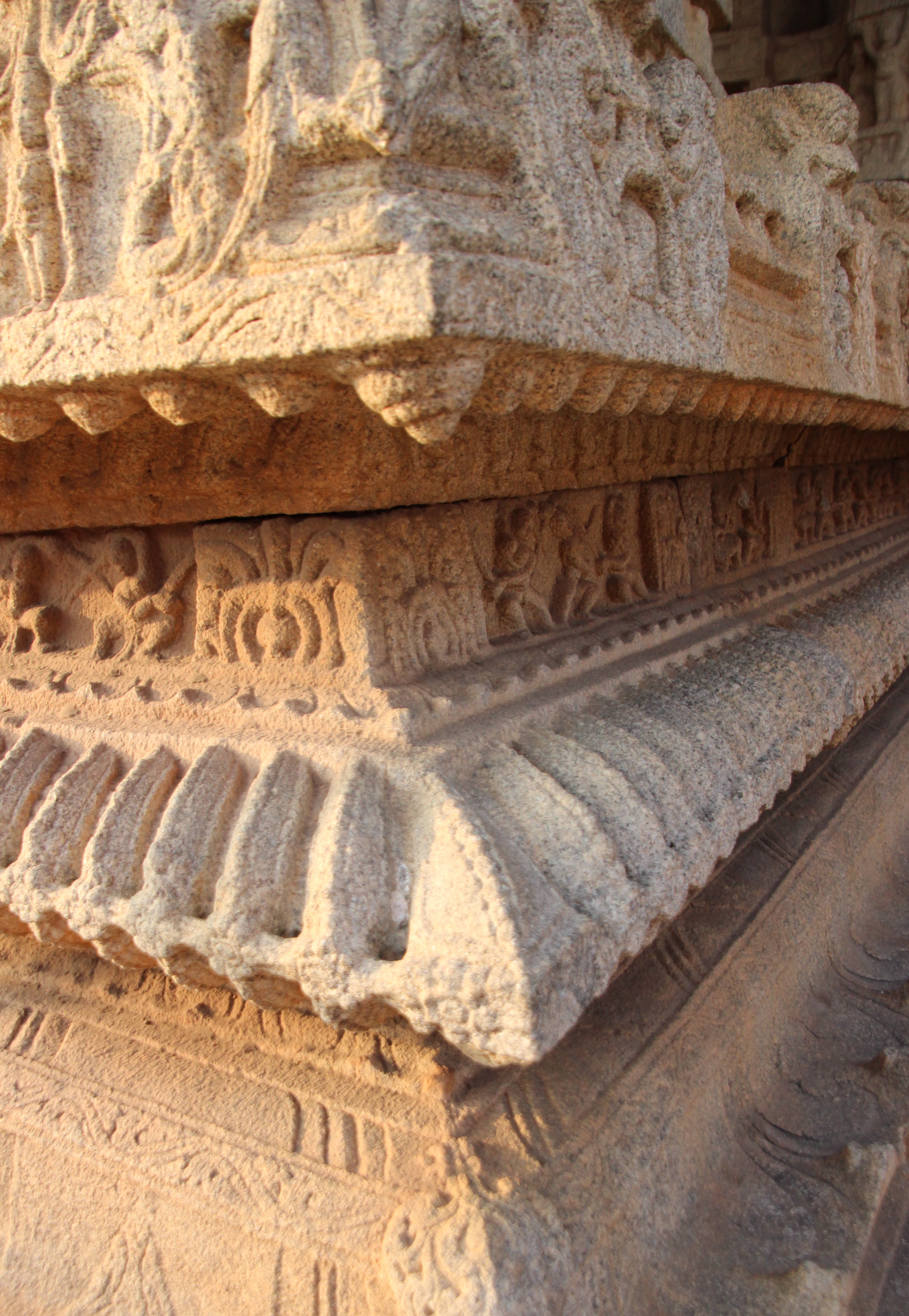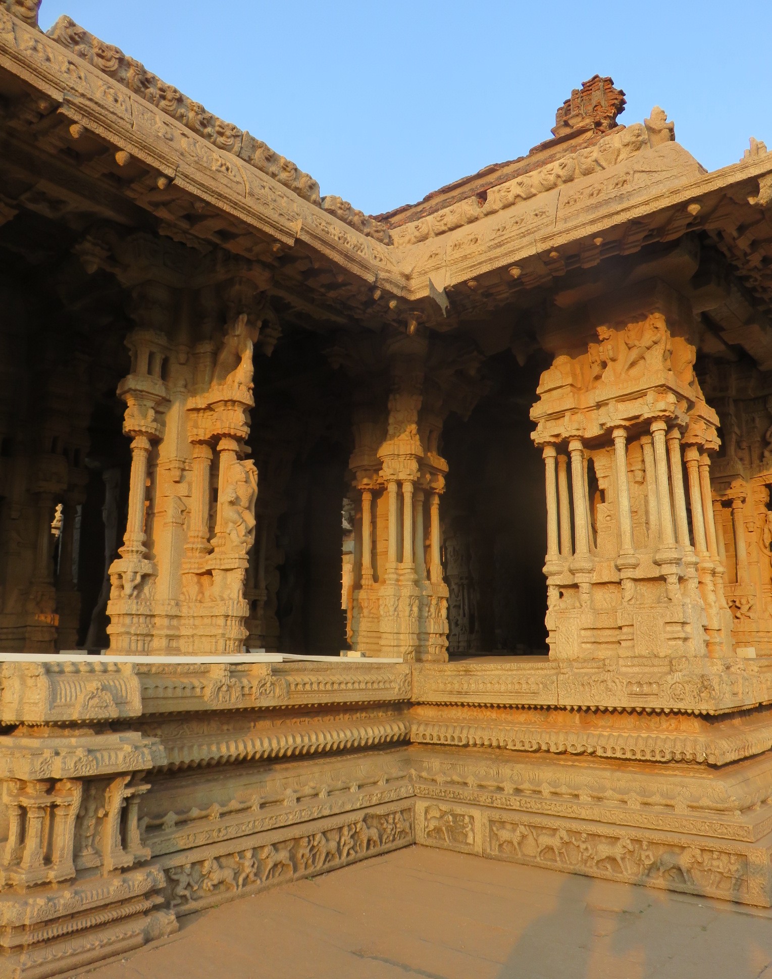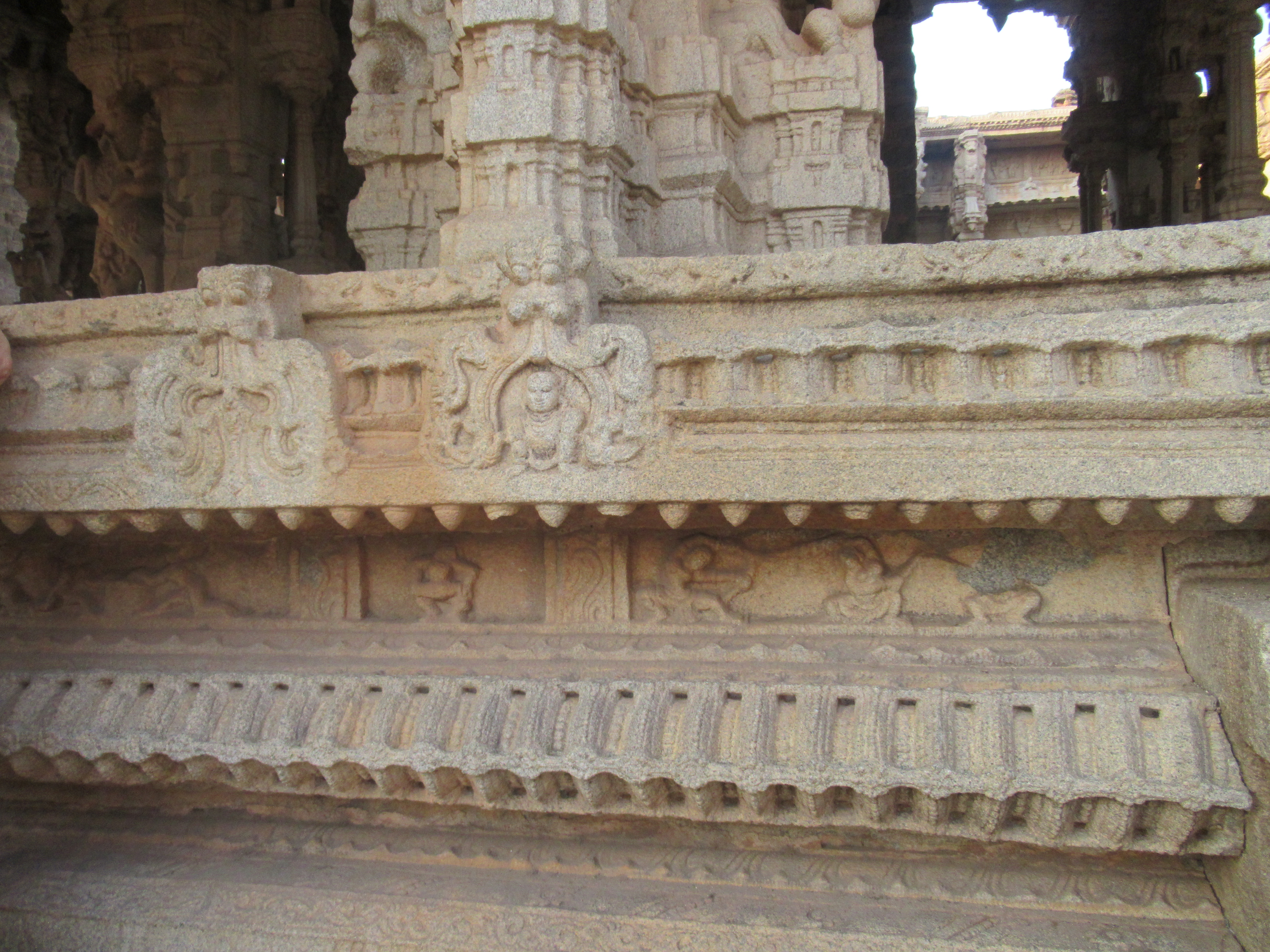 Les murs sont ornés de frises de chevaux, danseuses, musiciens… Des anneaux de pierre étaient destinés à recevoir des chaînes de pierre, aujourd’hui disparues. Le hall oriental était la salle de musique. Les 56 colonnes appelées « chantantes » émettaient des sons quand on les frappait. Un pilier central est entouré de plusieurs (sept?) petites colonnes, plus fines, sur lesquelles on frappait. Des colonnes ont été abîmées (les Anglais en ont même emporté deux pour les étudier). Maintenant, frapper sur ces colonnes est interdit.