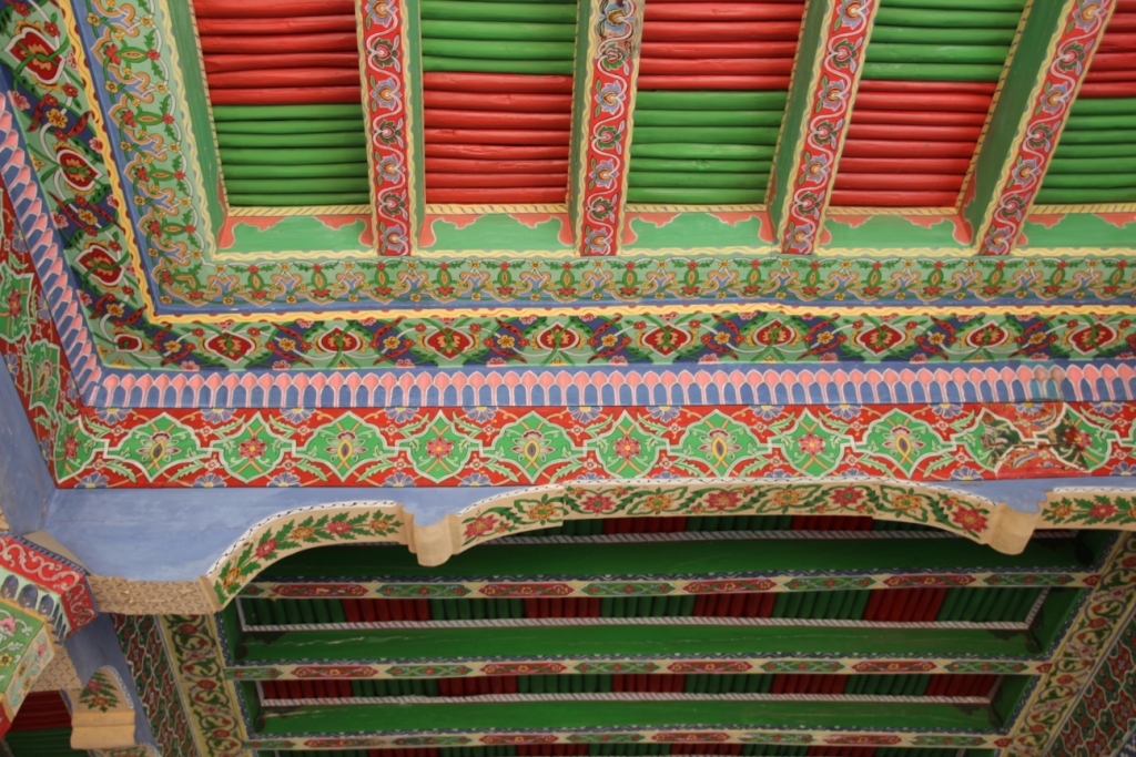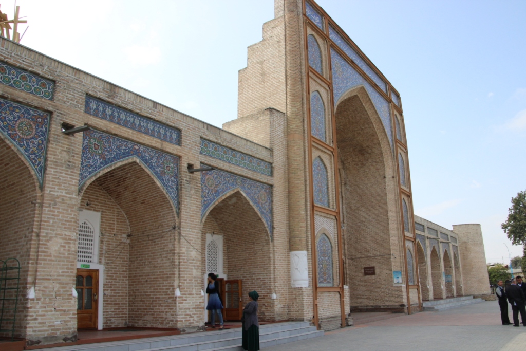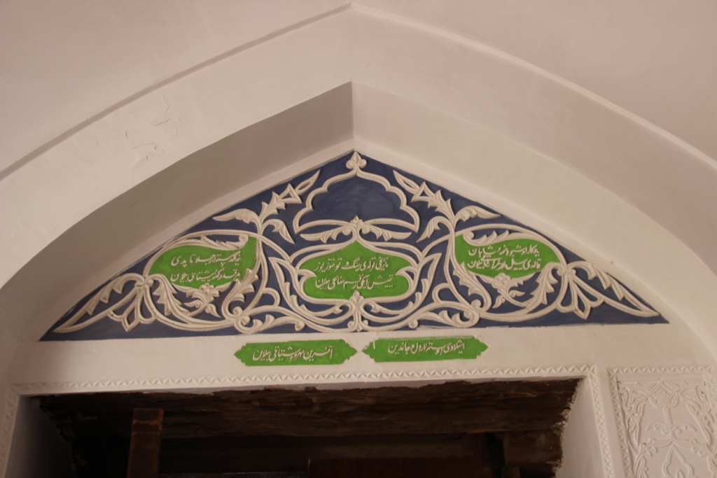 Nous arrivons ensuite devant le mausolée d’Omar Khan : le Dakhma-i-Chakhan (= tombe des rois). Il date de 1830 et se trouve dans une petite cour, entouré des mausolées de son fils, de son petit-fils et de son frère). Le mausolée a été restauré en 1970 et marie les styles des trois khanats : boiseries de Khiva, peintures du Ferghana et ornements en albâtre de Boukhara. Le portail en bois est gravé d’un poème de Nadira, la femme d’Omar. Le mihrab (=place de la bataille) est dans la direction de La Mecque.