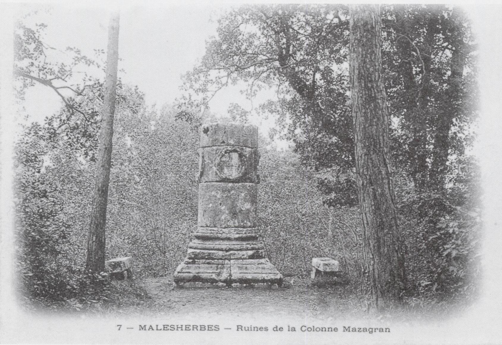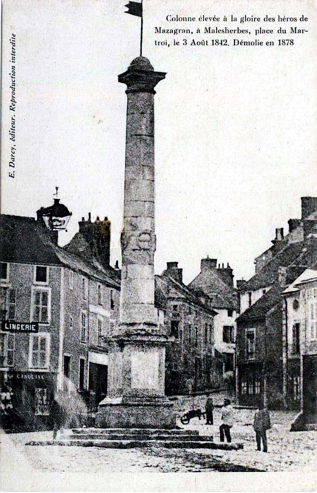 Le premier monument : Une colonne érigée en 1843 (souscription nationale en 1840) sur la place du Martroi. Le 13/02/1842, une ordonnance royale de Louis Philippe autorise la ville de Malesherbes à construire une colonne.Le 8 avril 1842 : adjudication des travaux (6 984 F) : 2 soumissionnaires (sculpteurs (Durand, 5200 F et Dallaine, 5800 F). C'est le projet d'Auguste Dallaine qui est retenu. Le 3 août 1842 : pose de la première pierre. Un flacon contenant différents documents est placé dans le piédestal.