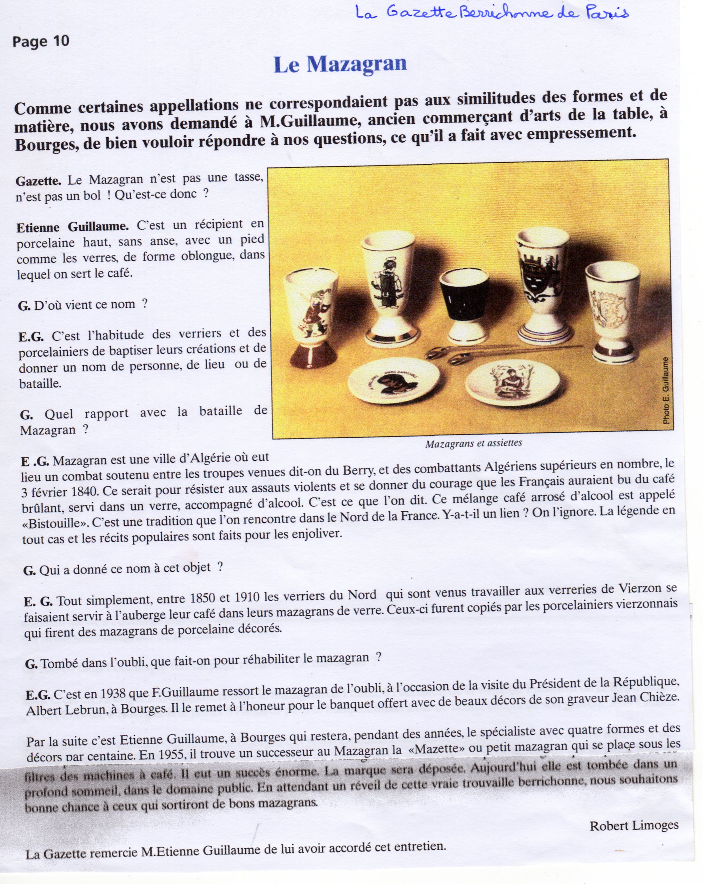 Quand vous prenez votre café, peut-être le buvez-vous dans des "mazagrans" ? Savez-vous que ce nom vient d'un siège qui eut lieu en Algérie en 1840 ? On dit que les soldats assiégés résistaient à coups de rasades de café fortement arrosées d'eau de vie. On dit que, de retour dans le Berry, ils continuèrent à boire leur café dans des récipients appelés "topettes", pour faire "comme à Mazagran". Pourtant, quand j'ai consulté, aux Archives militaires du château de Vincennes, les fiches des soldats (pas toutes les fiches, seulement 80 sur 123) aucun de ces soldats n'était berrichon !. On dit aussi que entre 1860 et 1900, les verriers du Nord vinrent travailler dans les ateliers de Mehun sur Yèvre (ou de Vierzon ?). Les porcelainiers copièrent ensuite les mazagrans en verre. Le nom fut donné d'abord à la boisson puis au récipient.