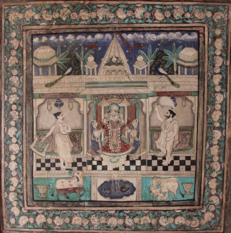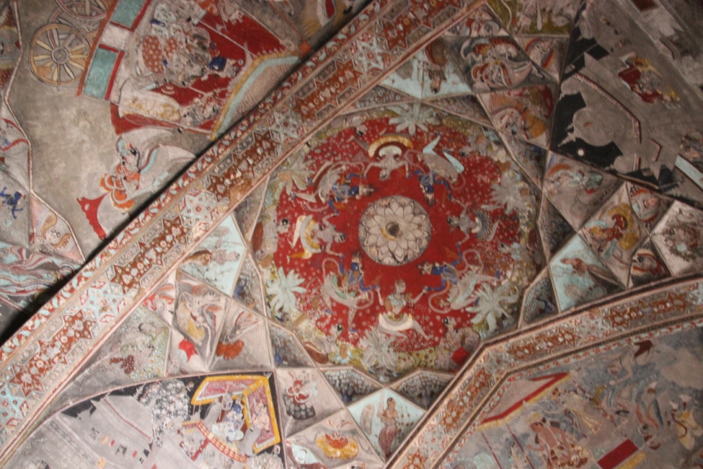 Nous empruntons un escalier étroit qui nous conduit au Badal Mahal, « palais des nuages » : construit en 1607 par Rao Raja Bhoj ji (1585-0607), il jouxtait le harem et était destiné aux plaisirs royaux. Les fresques ont été peintes par des artistes chinois et mongols en remerciement du logement. Sur les plafonds : Rama et Sita portés par des anges à leur retour d’exil, Krishna et Radha entourés par les gopi, bergères célestes, le mariage de Krishna et Radha.