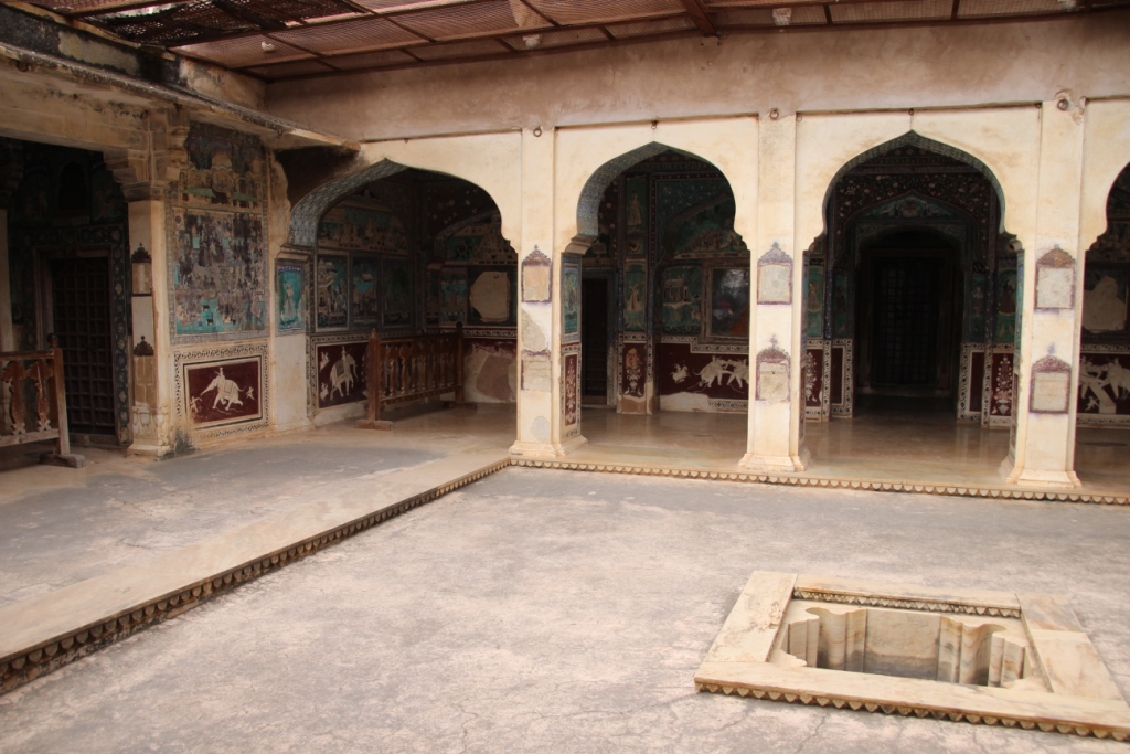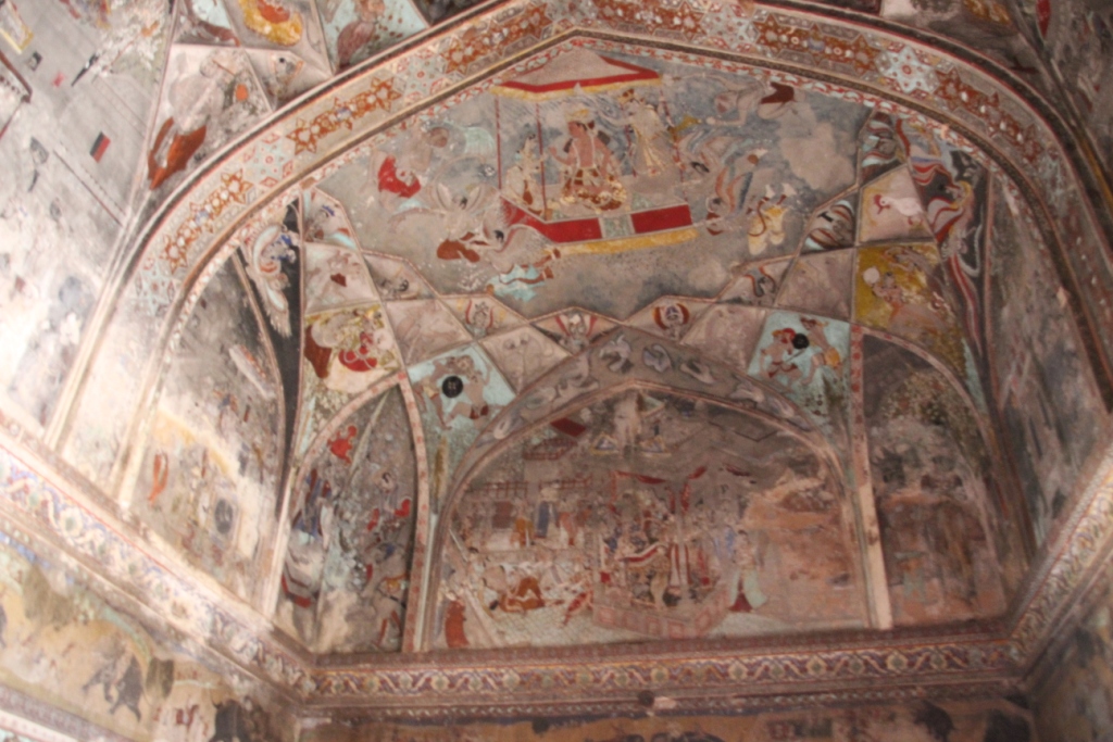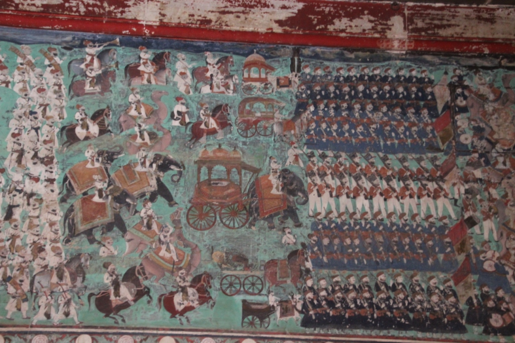 Nous montons au premier étage pour découvrir les fresques du Phol Mahal « palais des fleurs ou des plaisirs ». Dans la chambre, la fresque représente le départ à la guerre.