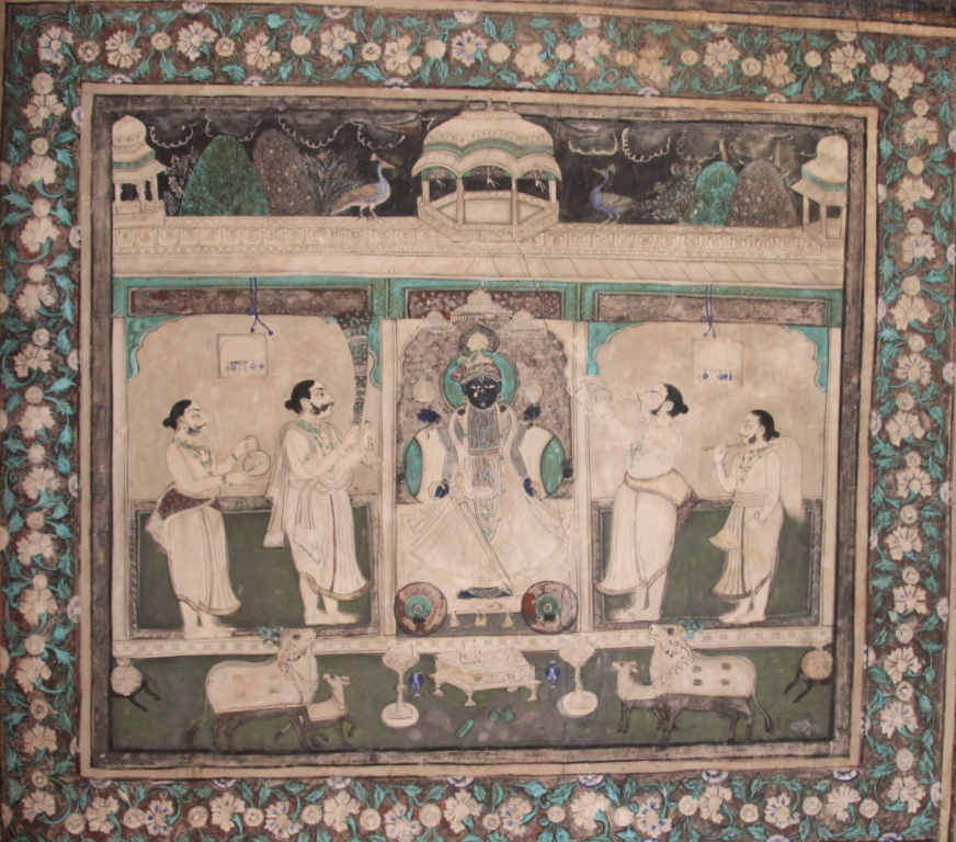 Krishna soulevant du doigt le mont Govardhan pour abriter ses amis bergers du déluge provoqué par Indra (en haut sur son éléphant). Indra descend du ciel pour s’excuser auprès de Vishnou, il est représenté tout petit aux pieds de Krishna. C’est un épisode du Mahabharata.