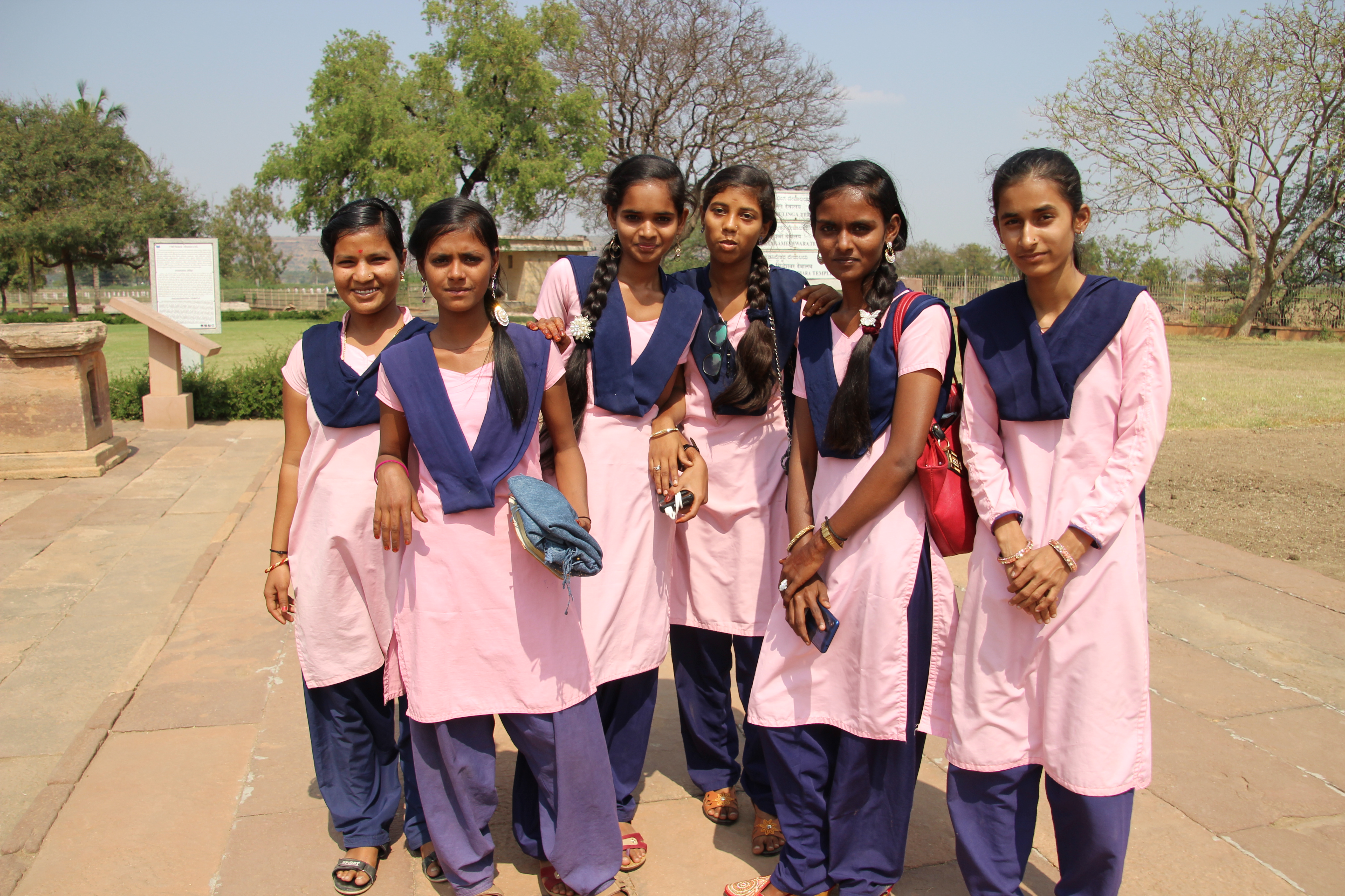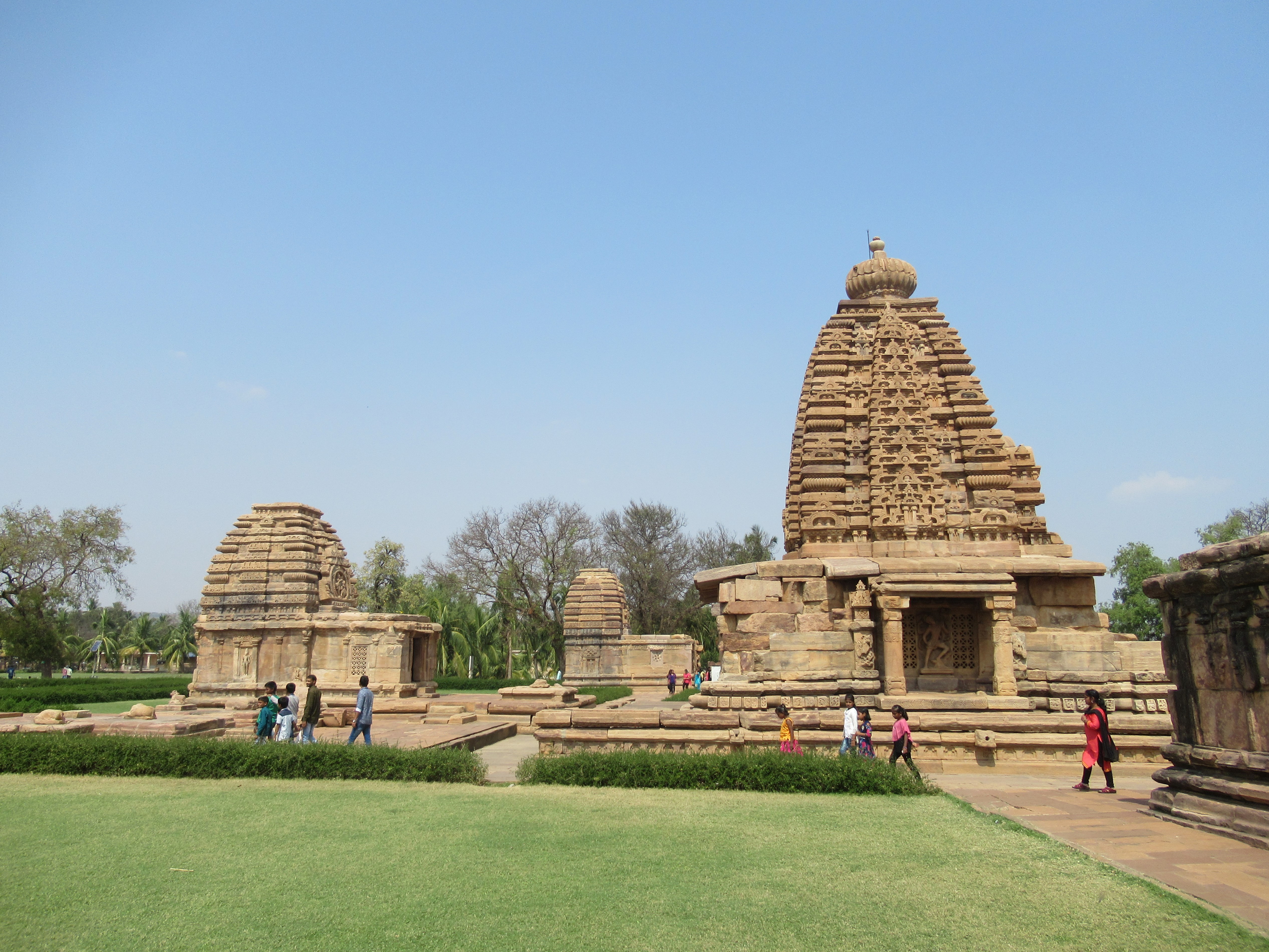 Deuxième site de la journée : Pattadakal, à l’ouest de rivière Malaprabha. Cette ville fut une des capitales du royaume chalukya ainsi qu’un site du couronnement des dieux. Comme le royaume Chalukya s’étendait sur une grande partie du pays, certains temples sont de style Inde du Nord (nagara) et d’autres dans le style Inde du sud (dravidien). Dans le style dravidien le sanctuaire est surmonté d’une tour (vimana ormé de pagodes carrées de plus en plus petites vers le sommet, dans le style nagara, la tour (sikhara) a la forme d’une pyramide bombée.