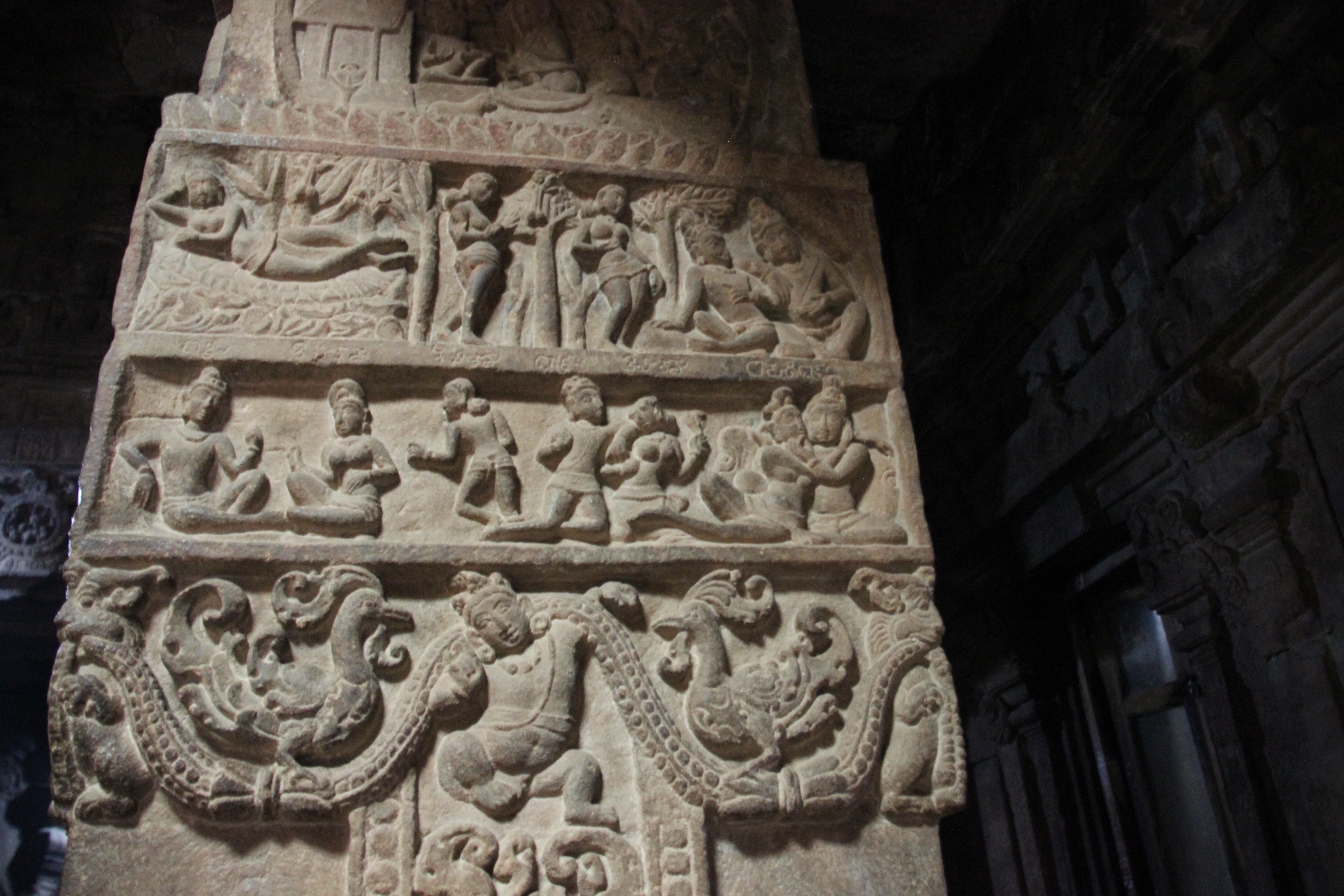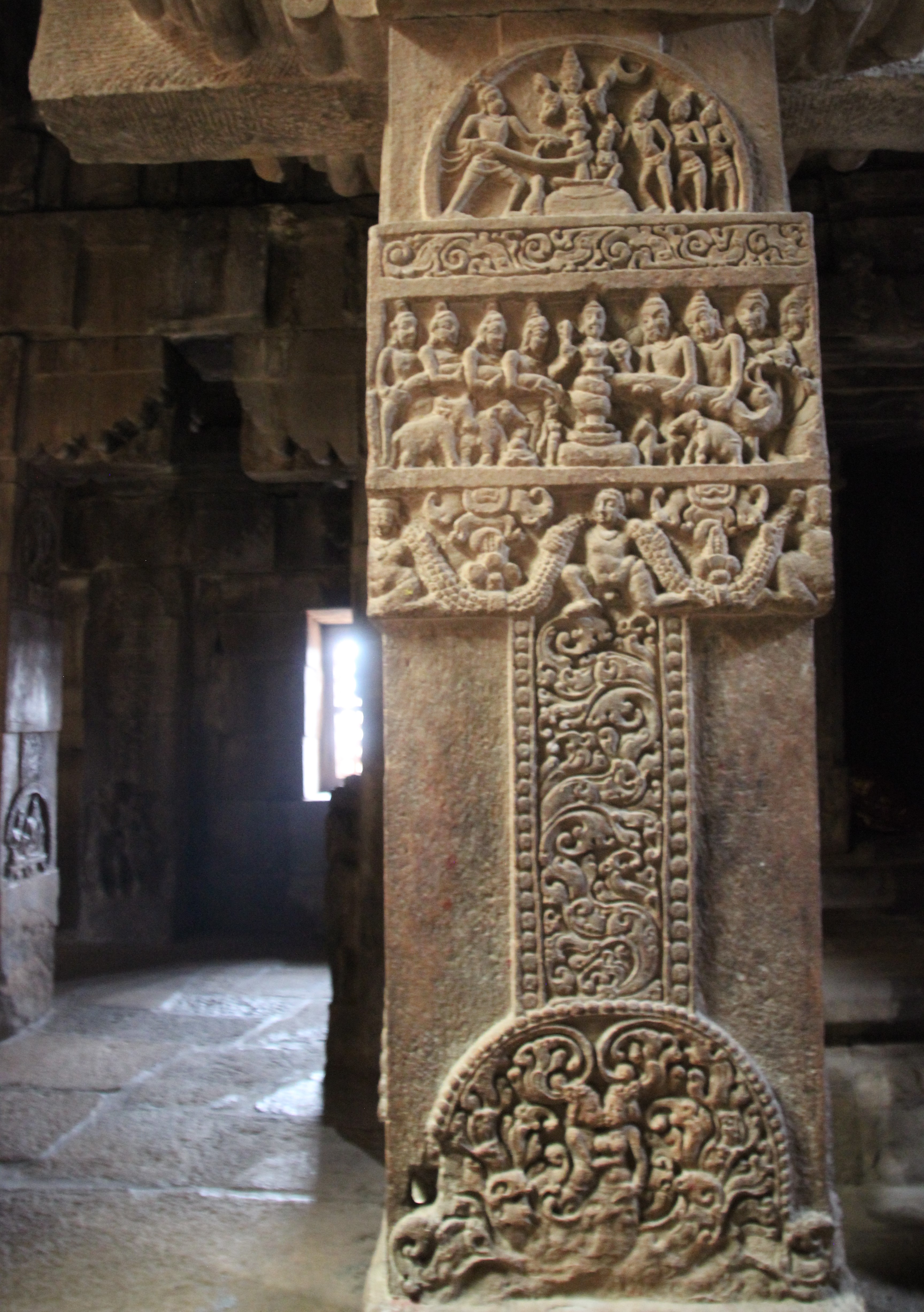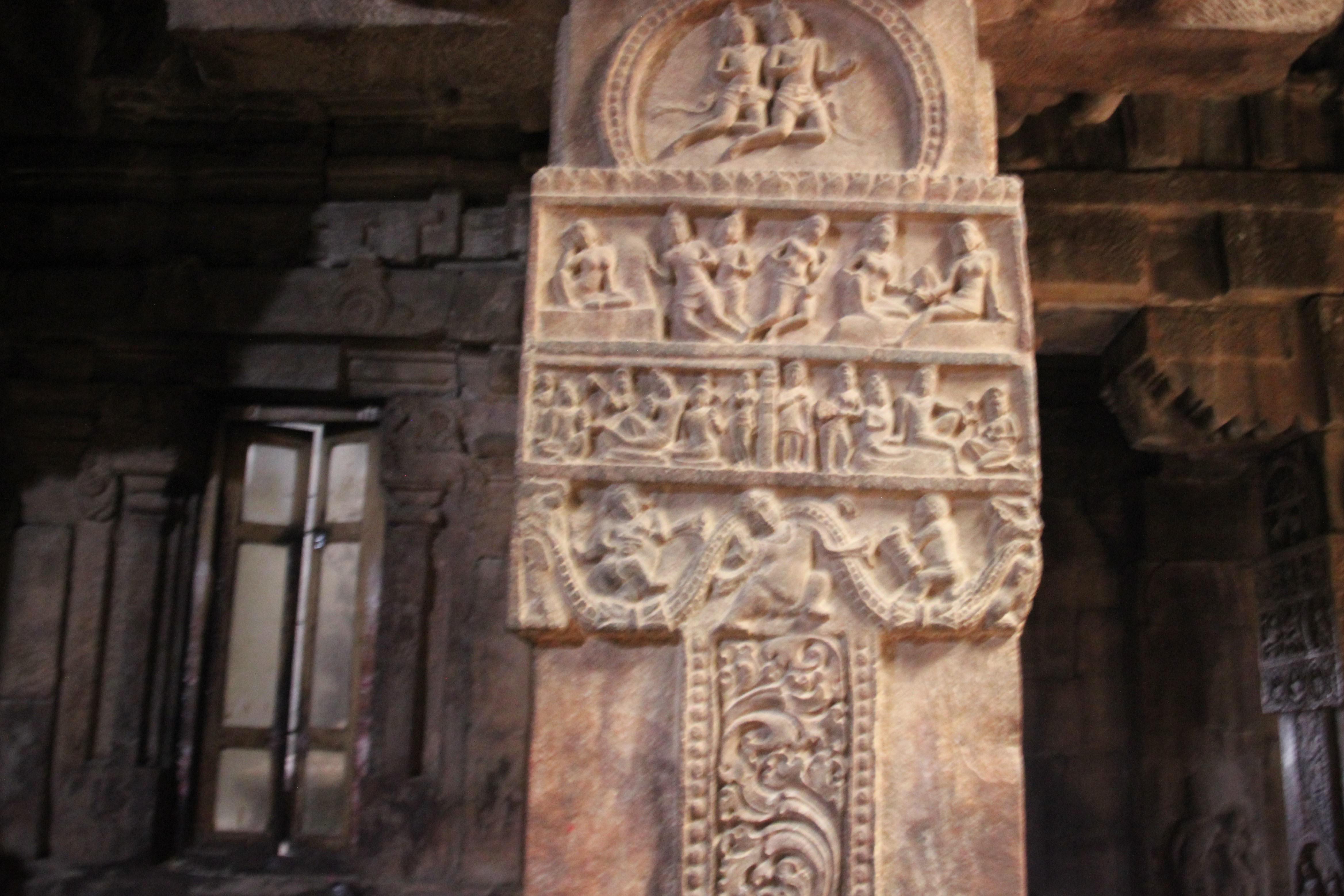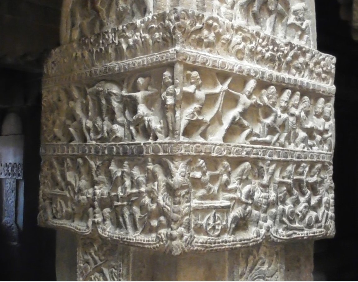 Nous pénétrons dans le mandapa À l’intérieur, les colonnes sont sculptées de scènes du Ramayana et du Mahabharata.
