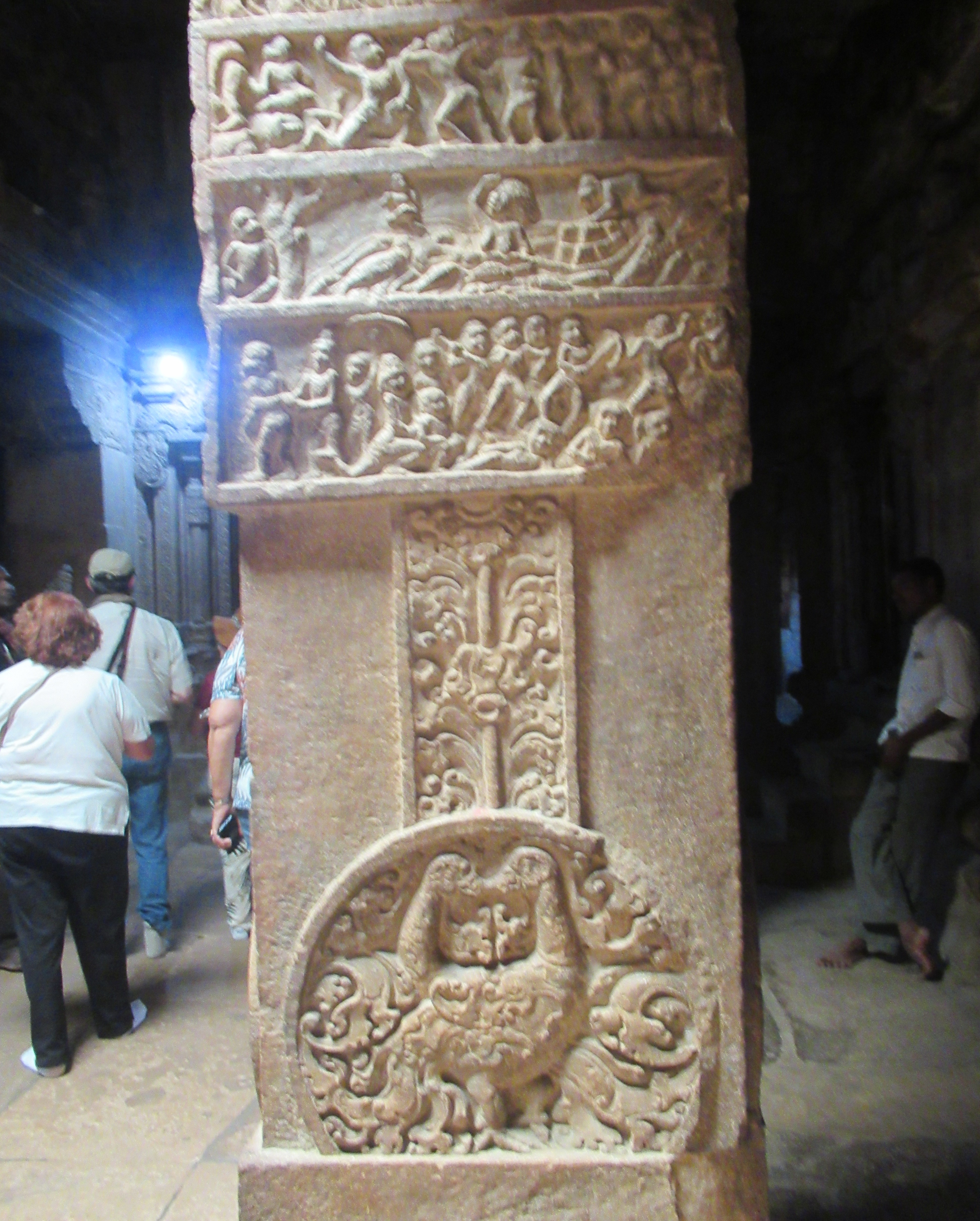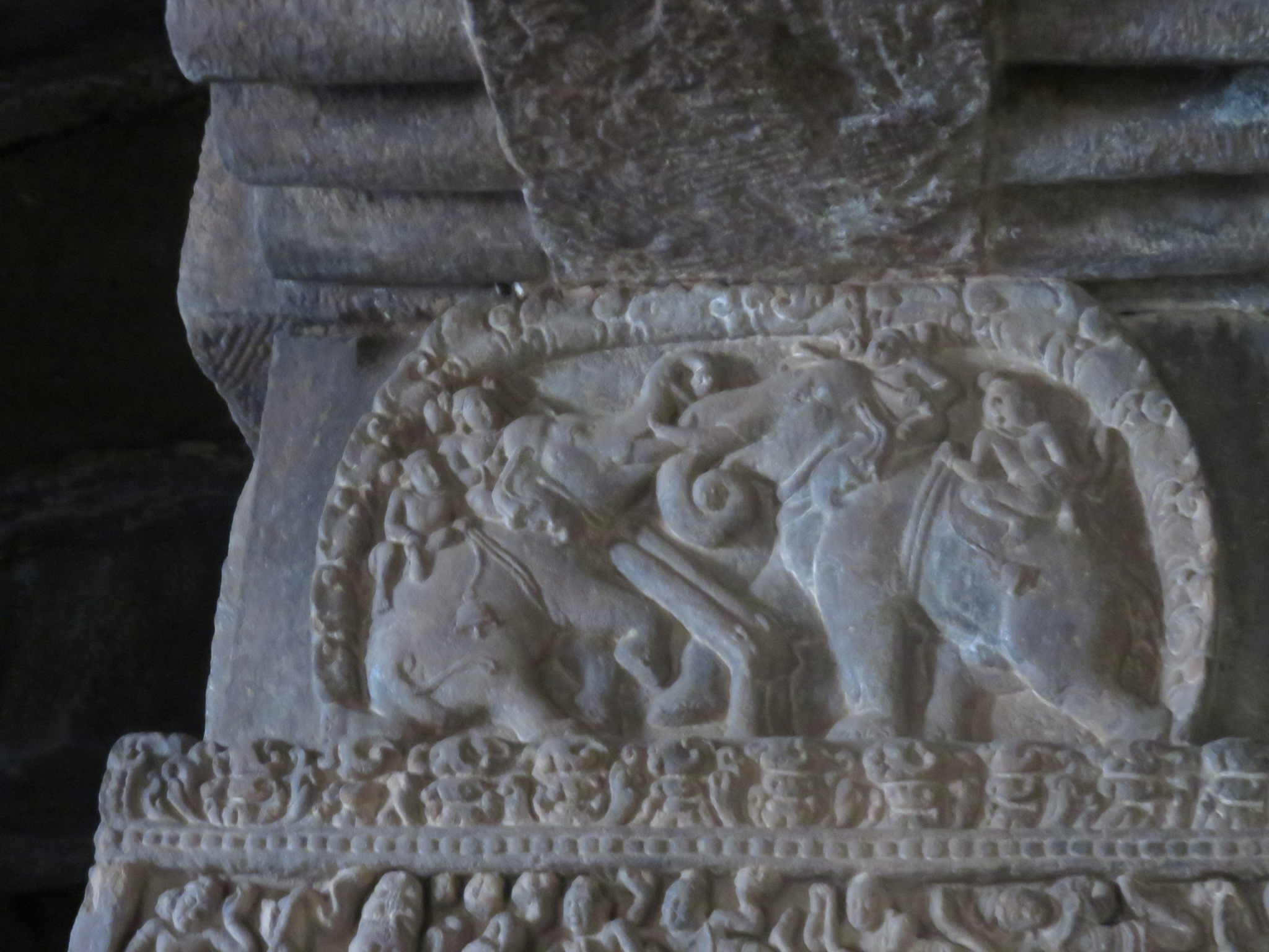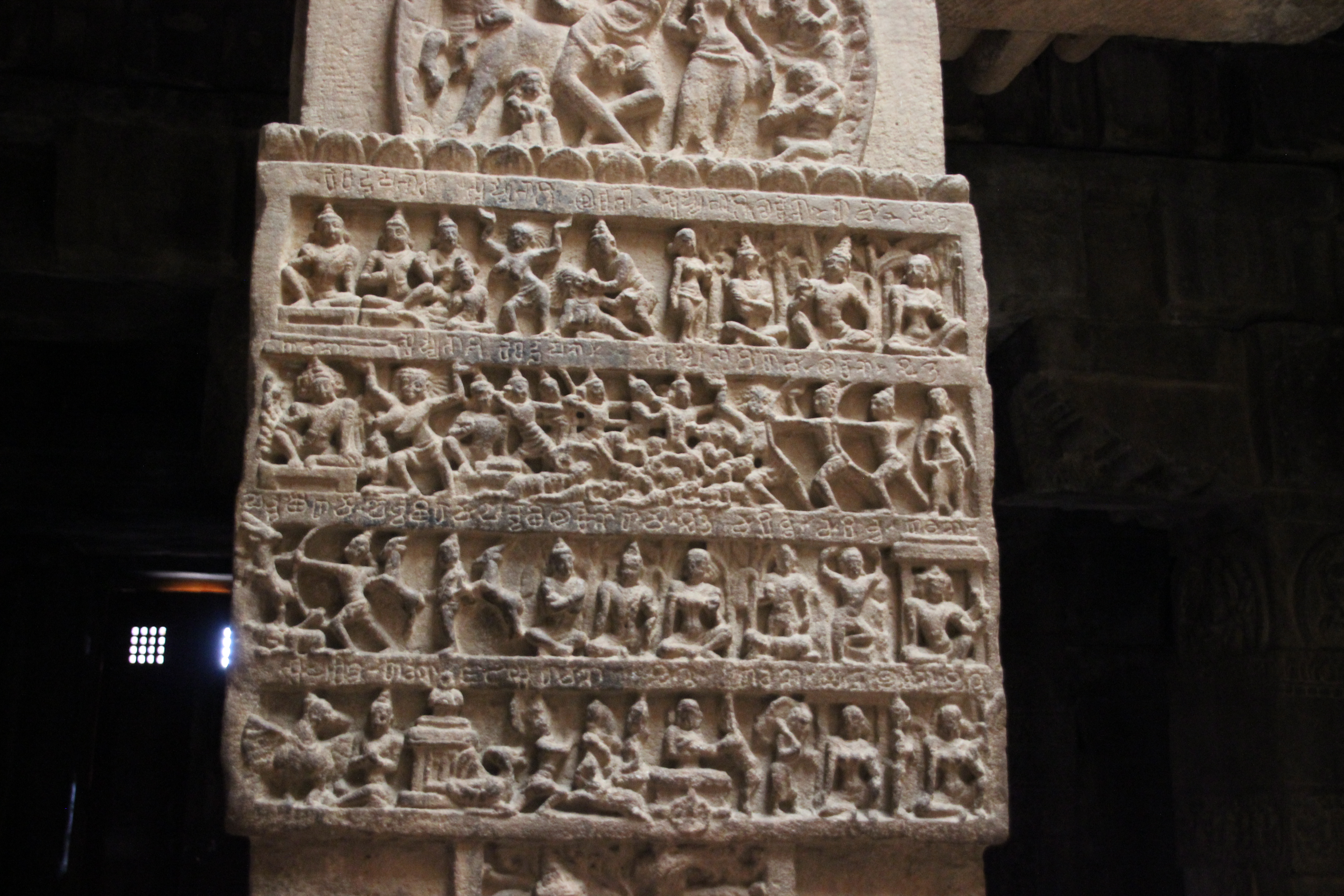 Nous pénétrons dans le mandapa À l’intérieur, les colonnes sont sculptées de scènes du Ramayana et du Mahabharata.