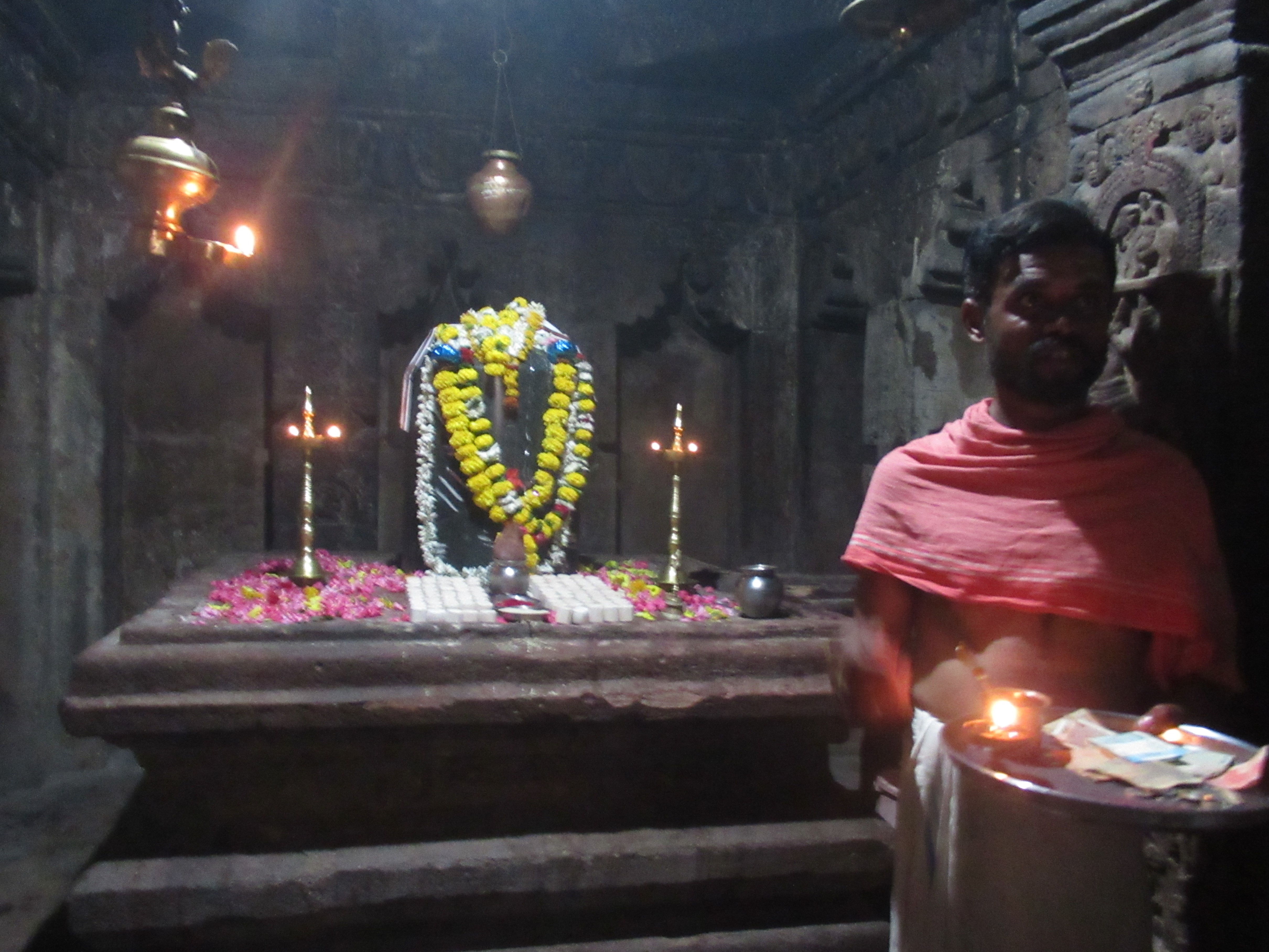 Tout au fond du mandapa, dans le sanctuaire, se tient un lingam noir, très décoré.À l'entrée, la cloche.