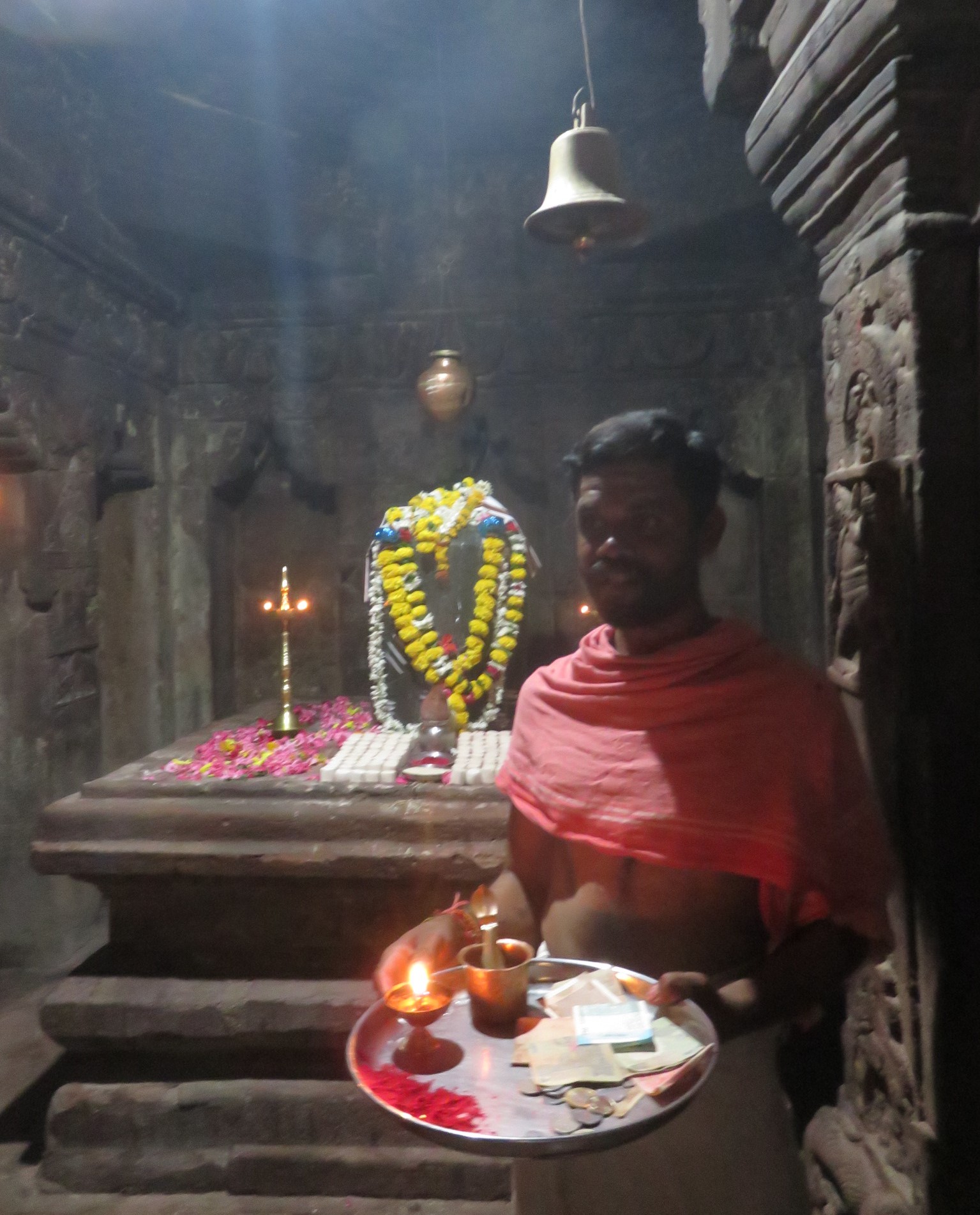 Devant le porche, un petit temple magnifiquement sculpté. abrite un beau Nandi noir. Un brahmane faisait des offrandes. À l’entrée, on voit une cloche (le ghanta) que les fidèles font tinter. C’est aussi un des attributs de Durga (visible sur le panneau du déambulatoire du temple e Durga à Aihole).